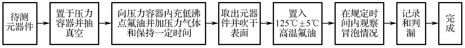 碳氟化合物粗检漏工艺流程如图2-51所示。浸泡在低沸点氟油(如约65℃沸点的氟利昂F113)中的元器件若有漏孔,则在高压空气或氮气等挤压下,氟油会进入元器件内部;经过一段时间后取出元器件并将之浸入到125℃高温氟油(如165~185℃沸点的FC43)中,元器件受热后内部的低沸点氟油就会沸腾变成气体,且随着压力的升高而由元器件的漏孔溢出形成气泡。这种方法的最小可检漏率约为10 -6 Pa·m 3 /s。需要注意的是,元器件表面沾污、涂覆层起皮等也容易产生“气泡”,对这种假漏现象要防止误判。另外,由于F113会对大气臭氧层造成破坏,未来的检漏技术发展趋势是采用激光干涉光学粗/细检漏等新方法。