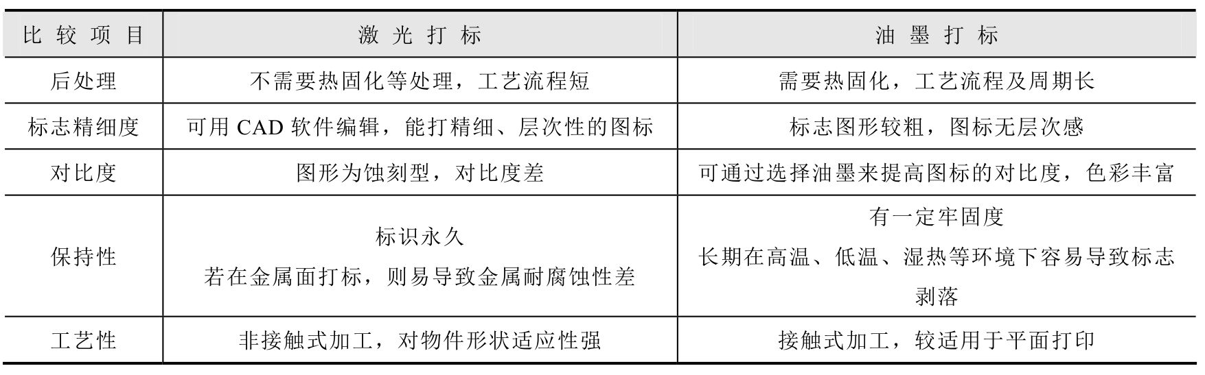 油墨印章移印类似盖图章,方法最简单,但打标效率低,质量较难控制。油墨丝网印刷类似书报印刷,适合批量操作,打标效率高。表2-4所示为激光打标与油墨打标工艺特点的比较。