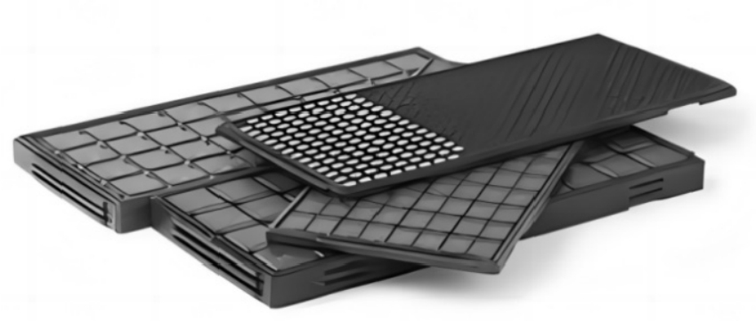 托盘包装是用矩形隔板使托盘按规定的空腔等分(见图2-64),再将元器件逐一装入盘内,一般为50只/盘,装好后盖上保护层薄膜。托盘有单层,也有3层、10层、12层、24层自动进料的托盘送料器。这种包装方法在刚应用时,主要用来包装外形偏大的中、高、多层陶瓷电容,后来也用于包装引线数较多的SOP等元器件。