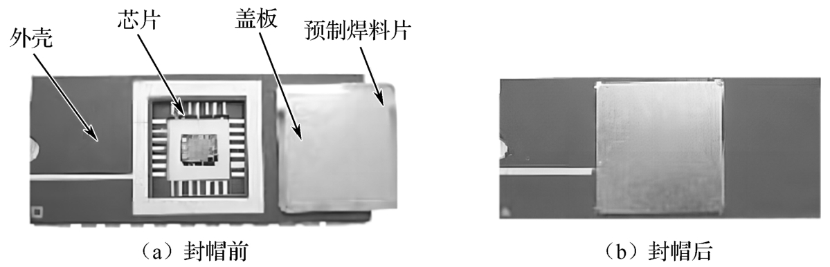 气密性封帽是气密性封装工艺流程的最后一道封装工序,也是关键工序。气密性封帽也为气密性封盖或封口,其主要作用是完成元器件壳体密封,保证环境气氛与元器件内腔气氛的扩散及渗透限制在规定的限额内。低温合金焊料封帽前后的外形变化如图2-44所示。