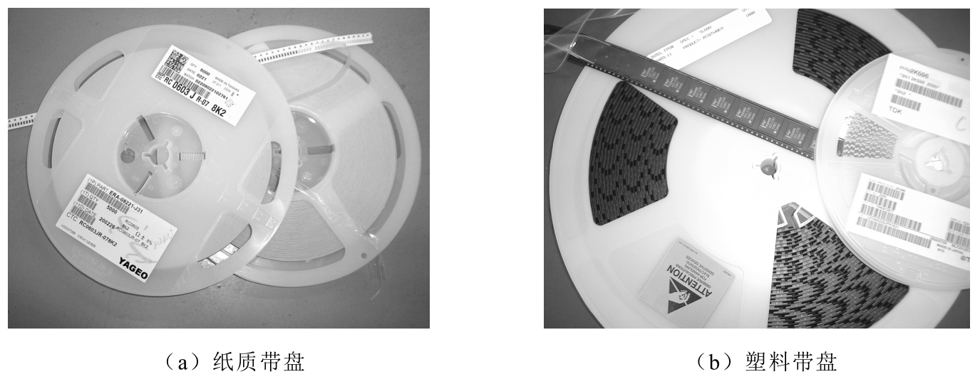 编带包装的特点是应用广泛、适应性强、贴装效率高,并已经标准化(见图2-54)。除QFP、PLCC、LCCC等大型元器件之外,其余元器件均可采用这种包装方式。编带包装所用的编带主要有纸编带、塑料编带和黏结式编带3种,带宽尺寸主要有8mm、12mm、16mm、24mm、32mm、44mm。