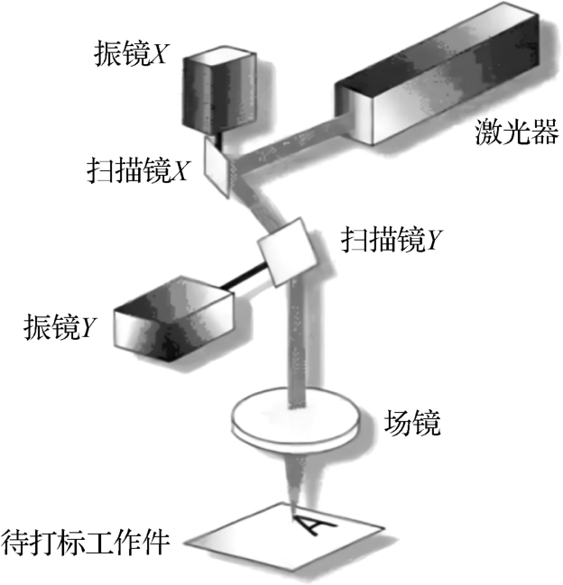其中,采用激光打标不需要油墨和油墨固化,打印质量高,但它是通过烧毁熔融元器件表面形成标识的,使用场合有一定限制。激光打标按工作方式可分为掩模式、阵列式和扫描式打标等。扫描式打标又分为机械扫描和振镜扫描,较普遍采用的是振镜扫描。振镜扫描式激光打标系统主要由激光器、 XY 偏转镜(振镜)、场镜(聚焦透镜)、控制计算机等部分组成,其基本工作原理是将激光器发出的激光束入射到 XY 偏转镜(振镜)上,用计算机控制两个振镜的反射角度,使它们沿 X 、 Y 轴扫描,从而实现激光束偏转,使高能量的激光聚焦点通过场镜在被打印材料上按要求的轨迹运动,从而熔融元器件表面材料形成永久的打印标记,如图2-52所示。