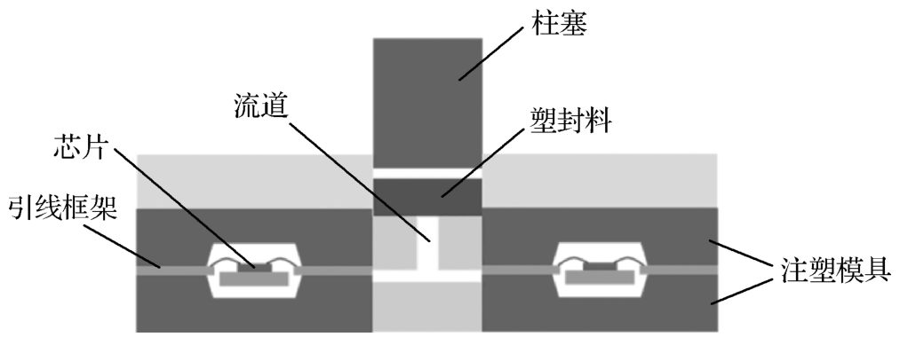 模塑封工艺可分为传递模塑封(又称为转移模塑封)、注射模塑封、反应注射模塑封和压缩模塑封。其中,使用最广泛、技术最为成熟的是传递模塑封,其封装过程如图2-41所示。通过加热加压的方式使热固性塑封料熔化,并通过流道传递到型腔内,保压固化后形成对元器件的封装。传递模塑封可以采用一模多腔的结构,因此可以大大提高生产效率,适合大批量的元器件封装。