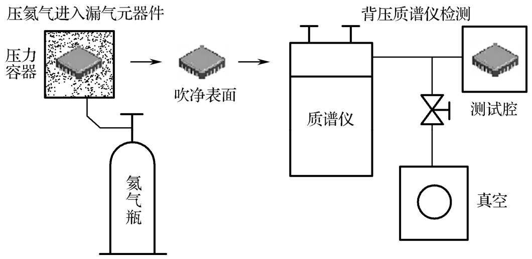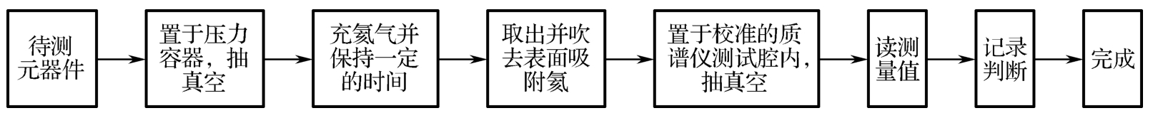利用质谱仪充压方法进行示踪气体氦(He)细检漏的基本工作原理如图2-49所示。待测元器件若漏气则有气体被压入,压入的气体经质谱仪离化室离子化,再由分析器分出氦离子,收集器收集氦离子并经放大器放大处理或数据转换处理,最后通过数表显示或终端设备输出。示踪气体氦(He)细检漏工艺流程如图2-50所示。
