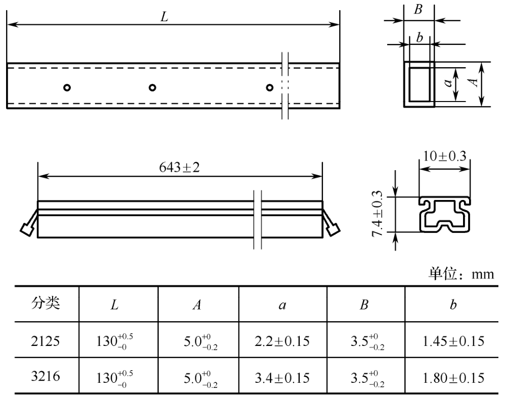棒式包装的有关尺寸如图2-62所示,其外形如图2-63所示。包装棒的端面型腔为矩形的则包装矩形元器件,型腔为异形的则只用来包装微调电容等异形元器件。