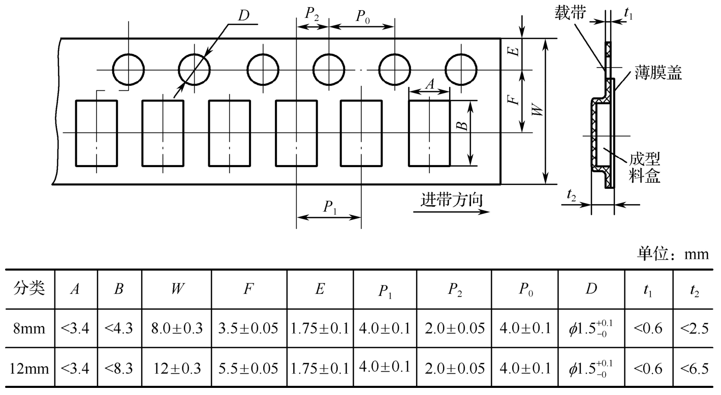 塑料编带因载带上带有元器件定位的料盒也被称为“凸形”塑料编带(见图2-57和图2-58)。它除了带宽范围比纸编带大,包装的元器件也从矩形扩大到圆柱形、异形及各种表面组装元器件,如铝电解电容、滤波器、SOP电路等。