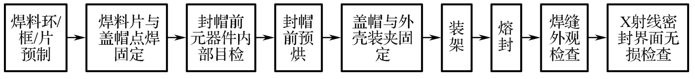 整体加热方法的低温合金焊料熔封的典型工艺流程如图2-45所示,主要由焊料环/框/片预制、焊料片与盖帽点焊固定、封帽前元器件内部目检和预烘、盖帽与外壳装夹固定、装架、熔封、焊缝外观检查和X射线密封界面无损检查等环节组成。为保证元器件的可靠性,封帽工艺过程中必须严格控制元器件内部的气氛,如水汽含量、氧气含量等;真空封帽工艺还需控制真空度;封帽前的预烘、装架过程,以及熔封过程也都必须在受控的环境气氛中进行。