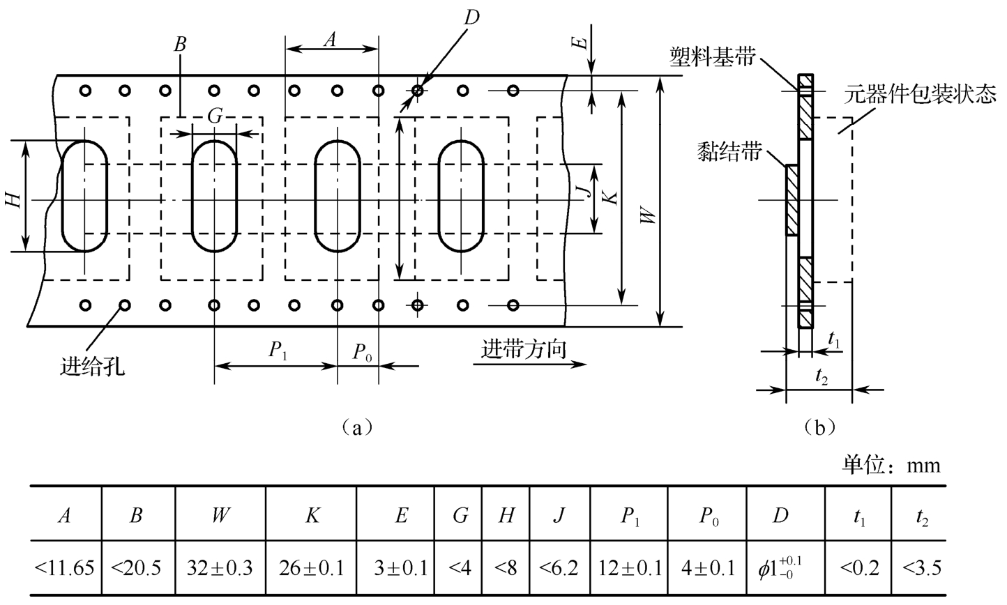 黏结式编带主要用来包装SOIC、片式电阻网络、延迟线、片式振子等外形尺寸较大的片式元器件,由塑料或纸质基带和黏结带组成,如图2-59所示。其包装方式是在基带中心部预制通孔(长圆形孔),编带时将黏结带贴在元器件定位的基带反面,利用通孔中露出的黏结带部分固定被包装元器件。图2-59(b)中的虚线表示元器件包装状态,图2-59(a)中用虚线表示的 A 、 B 尺寸则是被包装元器件的尺寸范围。基带两边的小圆孔,与上述编带一样,是传动编带时的进给定位孔。黏结式编带元器件的供料过程为:当编带进到料口时,由黏结带后面的针形销把元器件顶出,使元器件在与黏结带脱离的同时被贴装机的真空吸嘴吸住,然后贴放在印制电路板上。
