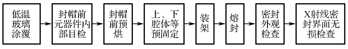 低温玻璃的气密性、抗机械冲击等性能相对于陶瓷要弱,为保证有足够的机械强度,玻璃熔封材料的温度要求一般不得低于385℃。玻璃熔封不可在低气压下进行,否则容易引起玻璃中的气泡长大,从而降低封口强度和封口的气密性。低温玻璃具有多孔性,容易吸水,为减少电路密封腔内部水汽含量值,应避免玻璃涂覆组装后长时间保存,一般均应在熔封前将金属引线框与陶瓷片进行组装。若组装并存放了一段时间后熔封,则需要在高温下经较长时间烘烤后再进行熔封。