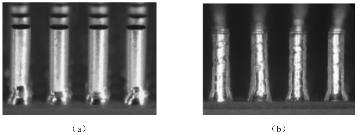焊柱直径约为0.5mm,高度为1.27mm或2.2mm。根据材料不同,焊柱有两种形式,如图3-6所示。图3-6(a)中的焊柱材料是10Sn-90Pb(IBM公司专利),图3-6(b)中的焊柱材料是20Sn-80Pb,并在焊柱外螺旋包裹了一层Cu箔(Six-Sigma公司专利)。