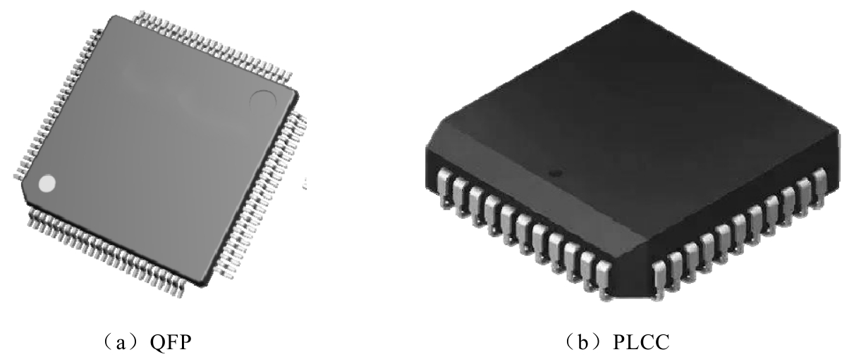 方形扁平式封装(QFP)是由SOP发展而来的,其外形呈扁平状,翼形引脚一端由封装的4个侧面引出,另一端沿着四边布置在同一平面上,如图3-2(a)所示。由QFP派生出的封装还有PLCC[见图3-2(b)]、载带封装(TCP)以及PQFP等封装形式。