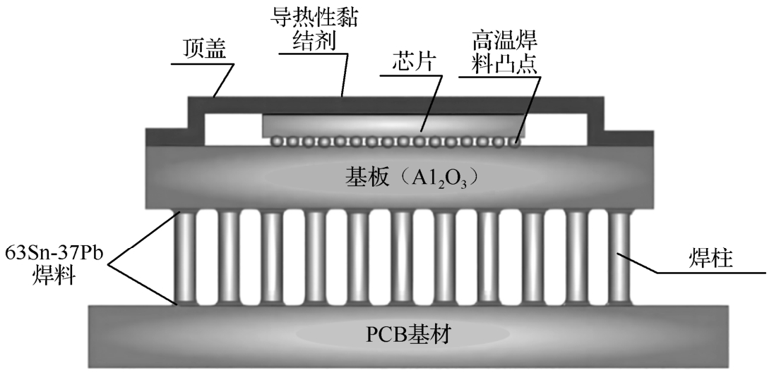 陶瓷柱栅阵列(CCGA)封装在CBGA封装的基础上,进一步扩大了封装尺寸、增加了I/O引脚数,是目前为数不多的能够批量生产的I/O引脚数超过1000个的一种封装类型。CCGA由基板、芯片、导热性黏结剂和焊柱等组成,如图3-5所示。