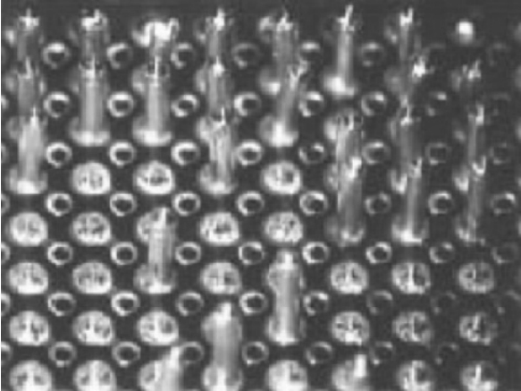 焊柱与基板有3种连接方式,分别为铸型柱、焊线柱和焊柱,均由IBM公司设计开发,如图3-7所示。焊线柱于1991年研发成功,它采用63Sn-37Pb共晶焊料将10Sn-90Pb高温焊柱焊接在基板上,10Sn-90Pb高温焊柱(固态275℃,液态302℃)在PCB上装配后基本保持原来的高度。在元器件生产的工艺流程中,焊线柱通常置于最后的工序,这有利于降低焊线柱在其他制作过程中可能造成的损伤,也适用于封装的自动化生产。但是在元器件返修时,焊线柱两端的共晶焊料会熔融,绝大部分焊线柱会留在PCB上,给返修造成困难,如图3-8所示。