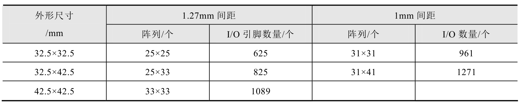 表3-1 常用的CCGA外形尺寸、阵列尺寸和I/O引脚数量