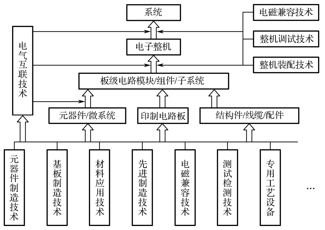 电气互联技术的作用是保障点与点、线(缆)与线(缆)、元器件/接插件与基板、组件与组件、组件与整机(系统)、整机(系统)与整机(系统)等电气互联点、件、系统之间的电气可靠连接和“联通”,其技术应用遍及电子产品(设备)制造的各个层面,如图1-2所示。