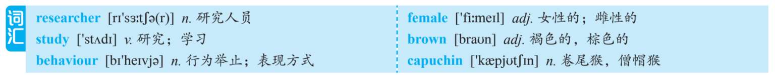 译文: 研究人员研究了雌性棕色卷尾猴的行为。