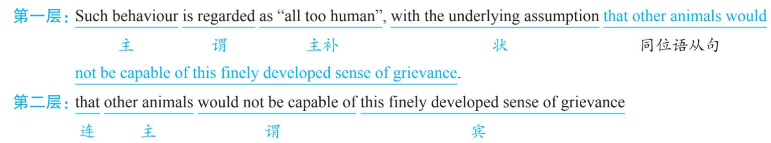 译文: 这种行为被认为是“人之常情”,其潜在的假设是,其他动物不可能具备这种高度发达的不满情绪。
