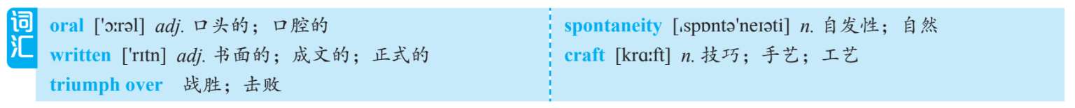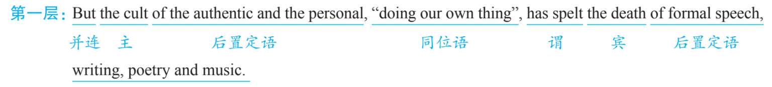 Ⅲ①But the cult of the authentic and the personal, “doing our own thing”, has spelt the death of formal speech,writing, poetry and music. ②While even the modestly educated sought an elevated tone when they put pen to paper before the 1960s, even the most well regarded writing since then has sought to capture spoken English on the page. ③Equally, in poetry, the highly personal, performative genre is the only form that could claim real liveliness. ④In both oral and written English, talking is triumphing over speaking, spontaneity over craft.