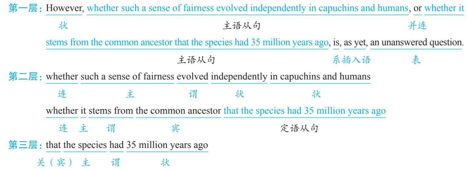 讲解: 该句为主从复合句,主句为主系表结构,其中主语部分为两个并列的主语从句。whether such a sense ... and humans为whether引导的主语从句,从句为主谓结构。whether it stems ... years ago也是whether引导的主语从句,从句为主谓宾结构,其中that the species had 35 million years ago为that引导的定语从句,修饰the common ancestor,从句为主谓宾结构。