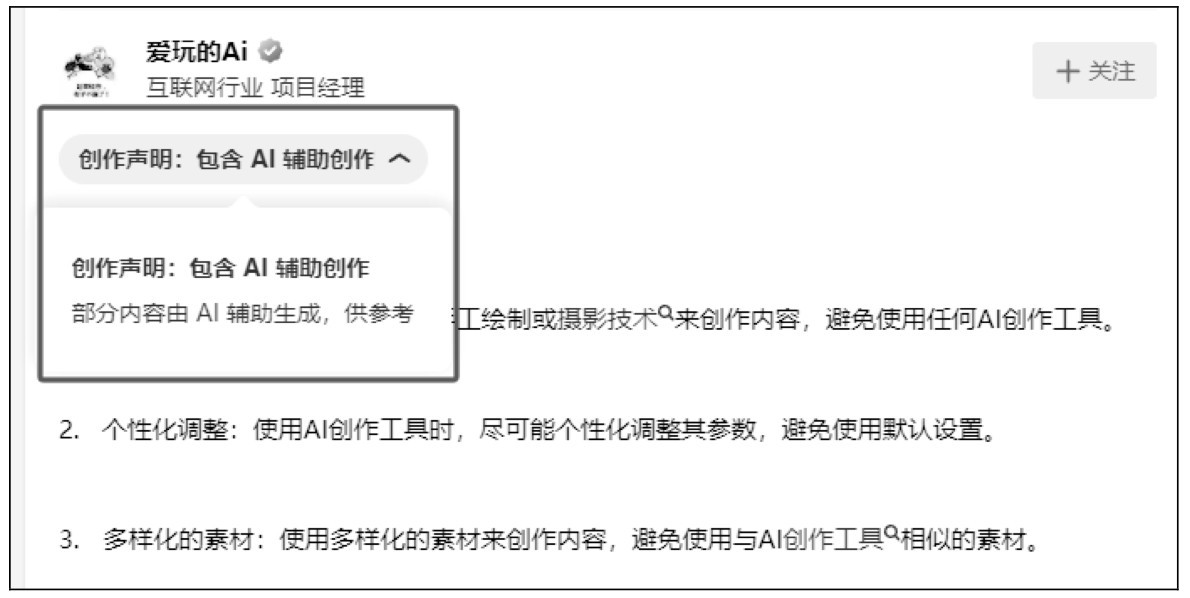 AIGC的透明度和用户信任是另一个重要挑战,用户需要知道哪些内容是由AIGC工具生成的。企业在使用AIGC工具时,应明确标识生成内容的来源,增强用户的信任感和AIGC的透明度。目前,许多社交媒体平台中已经可以注明内容为AI辅助创作,确保信息透明,如图1-13所示。