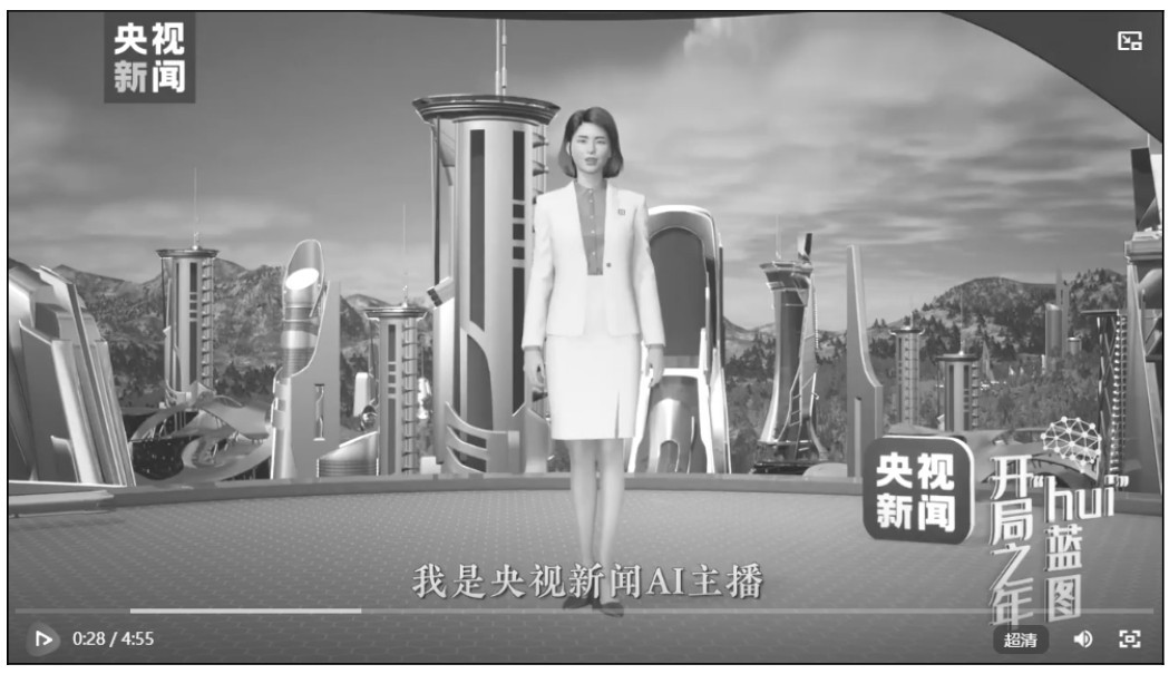 央视新闻AI主播央小新就是一个非常典型的AIGC技术在新闻媒体中的应用案例。央小新是由中央广播电视总台打造的人工智能主播。央小新背后是一套强大的AIGC系统,能够根据提供的新闻脚本或实时事件自动产生相应的播报内容。图1-14所示为央小新主持节目的场景。