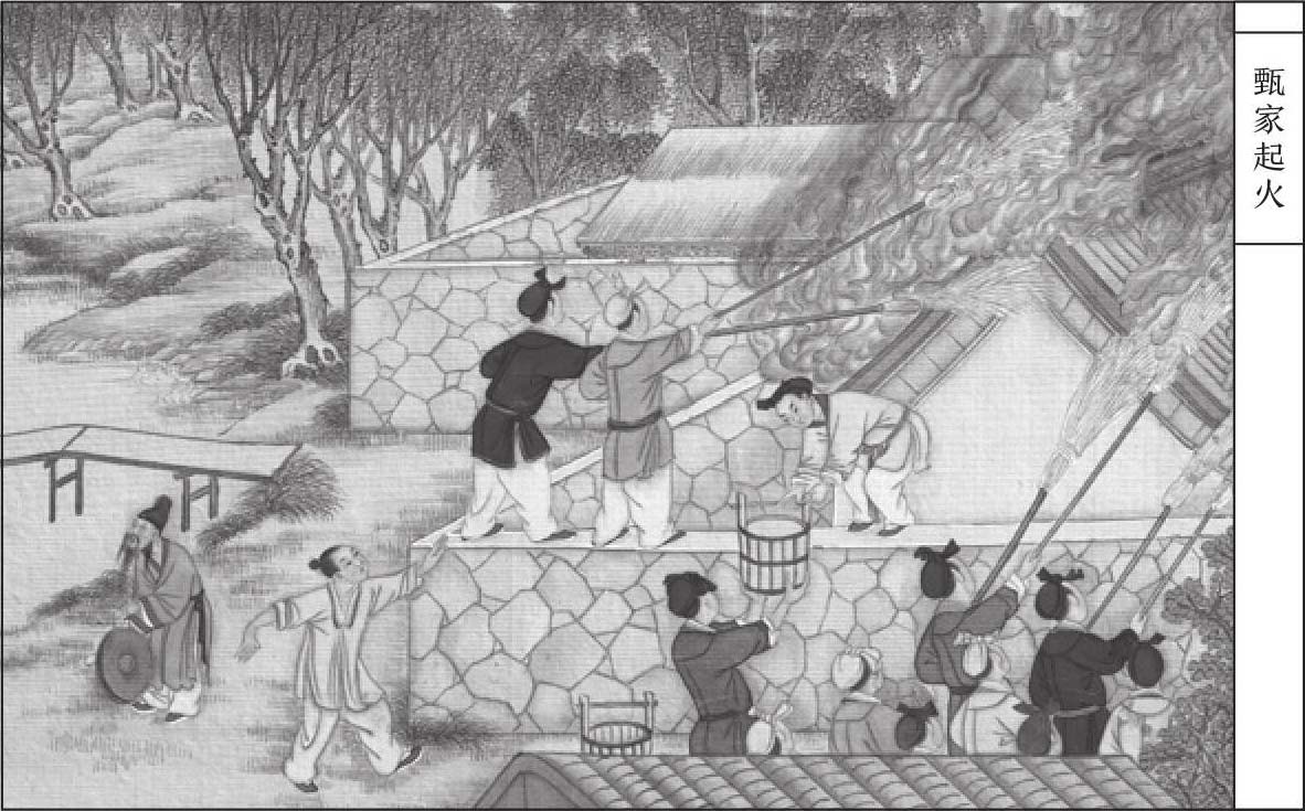 。那士隐夫妇半世只生此女,一旦失去,何等烦恼!不想这日三月十五,葫芦庙中炸供,将一条街烧得如“火焰山”一般。只可怜甄家在隔壁,早成了一堆瓦砾场了。士隐跌足长叹,与妻子商议且到田庄上去住,偏值近年水旱不收,贼盗蜂起,官兵剿捕,田庄上又难以安身,只得将田地都折变了,携了妻子与两个丫鬟,投他岳丈家去。