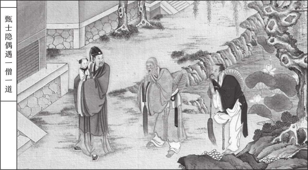 一日,炎夏永昼,只见从那边来了一僧一道,看见士隐抱着英莲,那僧乃指着他大笑,口内念了四句言词: