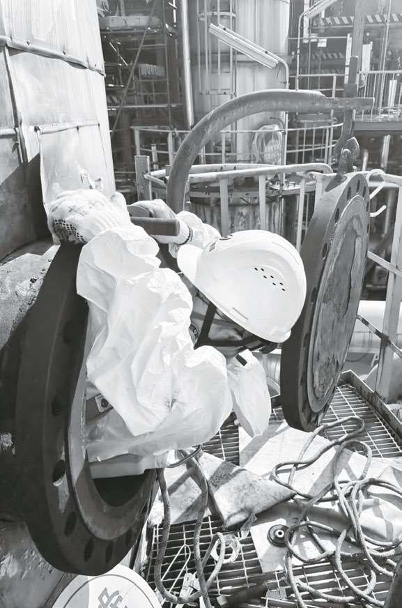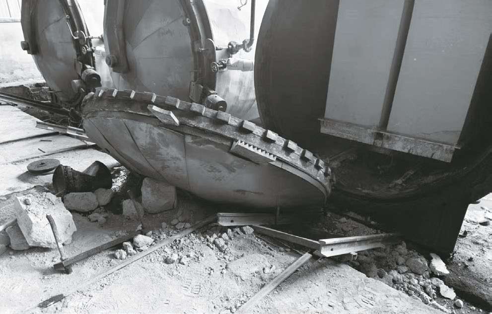 2024 年 2 月,江苏某公司的一台蒸压釜的封头脱落,导致一名操作工死亡。事故的直接原因是釜臂与封头连接的角焊缝开裂,导致封头在上开后发生脱落,刚好砸到位于其下方进行作业的操作工,导致该操作工死亡,如图 2-1、图 2-2 所示。
