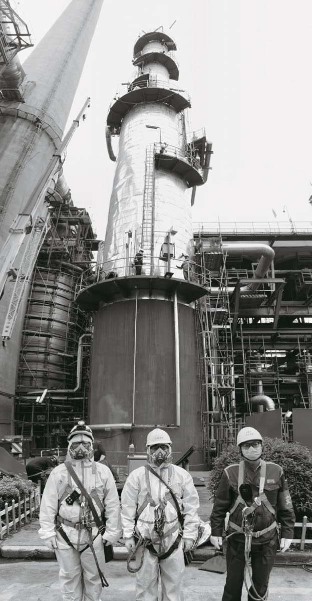这种检验对于准备工作要求高,宏观检查内容看似少,很简单,但是严格做到却非常难,导致很多检验员在检验时困难重重。比如,图 2-7 和图 2-8 中的塔器,高达 100 多米,塔器外部只在人孔处设置了检修平台,并且塔器带有保温。如果要对塔器的外表面进行宏观检查,存在非常大的困难:首先,很多地方没有检修平台,无法进行外表面的宏观检查。其次,如果全部拆除保温,代价大,使用单位只愿意部分拆除,导致不能对塔器进行整体性的宏观检查,从而导致缺陷漏检。在实际的检验中,也确实存在很多容器因拆保温不到位,最后没拆保温的部位恰恰是容器修理过的部位;还有的搪玻璃容器,如果保温拆除不到位,就不知道夹套外表面的腐蚀情况到底如何,更严重的是,如果使用单位私自进行过复搪,也很难被发现。另外,有些容器由于结构特殊,也很难对之进行宏观检查。比如某些不可拆卸的换热容器、石墨容器,没有人孔及检查孔,不但无法对容器的内表面进行有效的宏观检查,而且能检验的部位极其有限,这就导致了缺陷的漏检,给容器的使用埋下了安全隐患,这也是基于损伤的检验最突出的局限性。