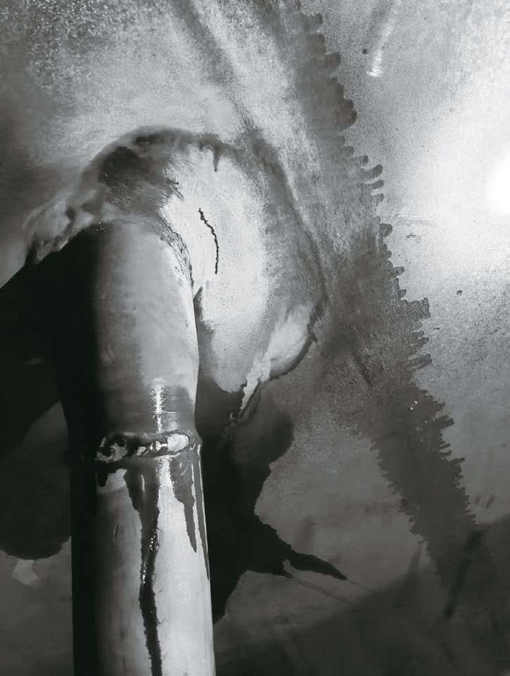 案例二:2022 年 3 月 24 日,对南通某公司的一台反应器进行开罐检验,在对容器封头顶部的一个接管处进行宏观检查的时候,隐隐约约发现疑似裂纹,于是对该处进行渗透检测,发现存在开裂现象。随后对该部位进行打磨,打磨后裂纹完全消除,从打磨的位置判断,裂纹长约50 mm,深约 7 mm,容器板厚 12 mm,位于接管角焊缝附近的热影响区。该裂纹的表面不明显,而且还有一些介质覆盖在其上面,很隐蔽,很不容易被发现。何况这是台 200 立方米的储罐,想完全发现所有位置的缺陷还是有相当大的难度的。接管角焊缝处发现开裂如图 2-4 所示。