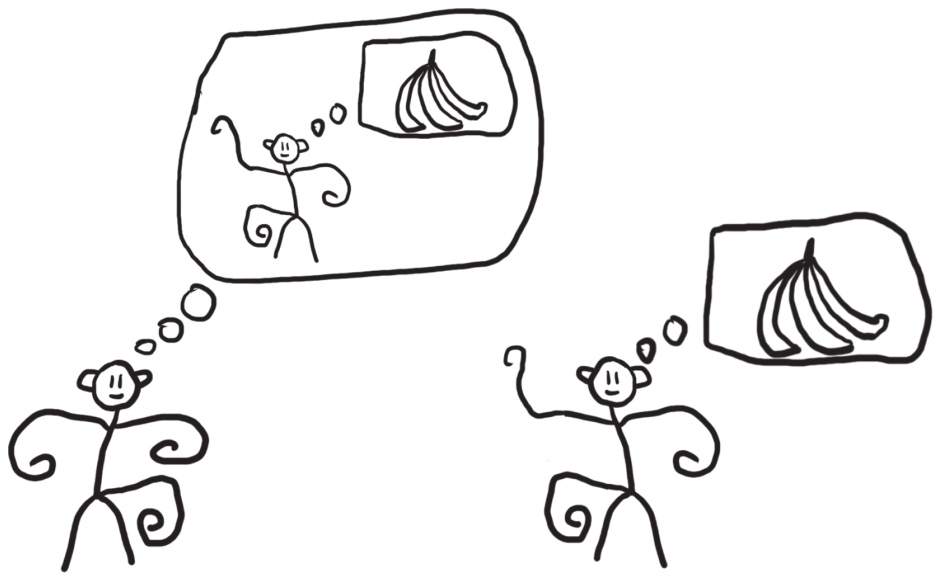 这两种场景之间有什么区别呢?根据塞尔的观点,这两种场景正反映了所谓的“我的意图”与“我们的意图”的不同。尽管野餐者的一致行为看似是共享意图的结果,但事实上,他们只是“自私自利”的个体的集合。他们的行动碰巧一致,这是因为他们都在对同样的刺激做出反应——他们用一种看上去协作一致的方式来满足私利。然而,舞者是有意选择协作一致的,这体现了“我们的意图”。同样,其他动物的一致行为或许看似基于一种集体意图,但在大部分情况下,它们显然是在一致的自我利益驱使下进行活动的。 [5]