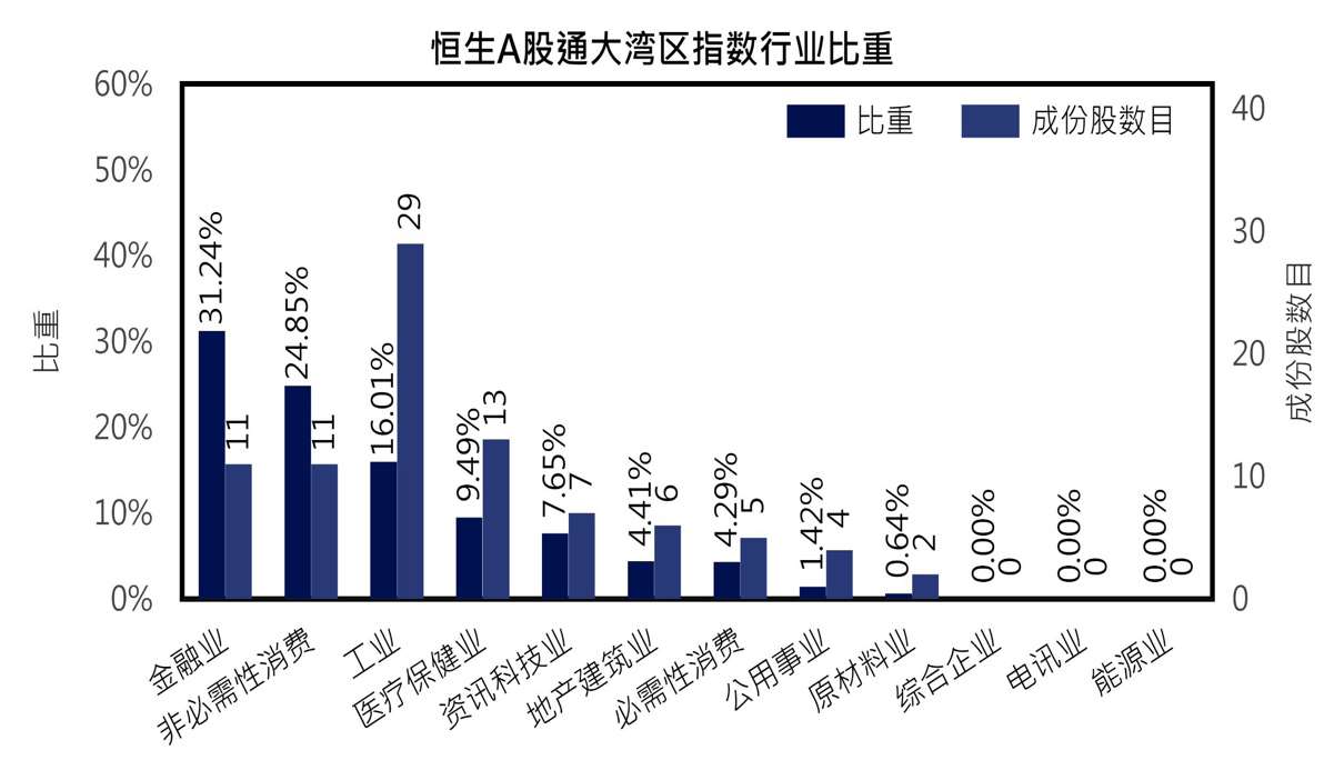 推出日期:2019年4月15日。基值:3000。成分股数目:88。选股范畴:旨在反映于粤港澳大湾区营运的香港上市公司及中国内地上市公司之表现,而这些公司须符合资格透过互联互通机制进行南向或北向交易买卖。合资格在互联互通下交易的A股和恒生综合指数成份股。总部要求:合资格公司的总部必须在九市二区,东莞、佛山、广州、惠州、江门、深圳、肇庆、中山、珠海、香港、澳门。收入要求:合资格公司的在最新完整财政年度中的总收入必须有50%以上来自内地、香港或澳门。