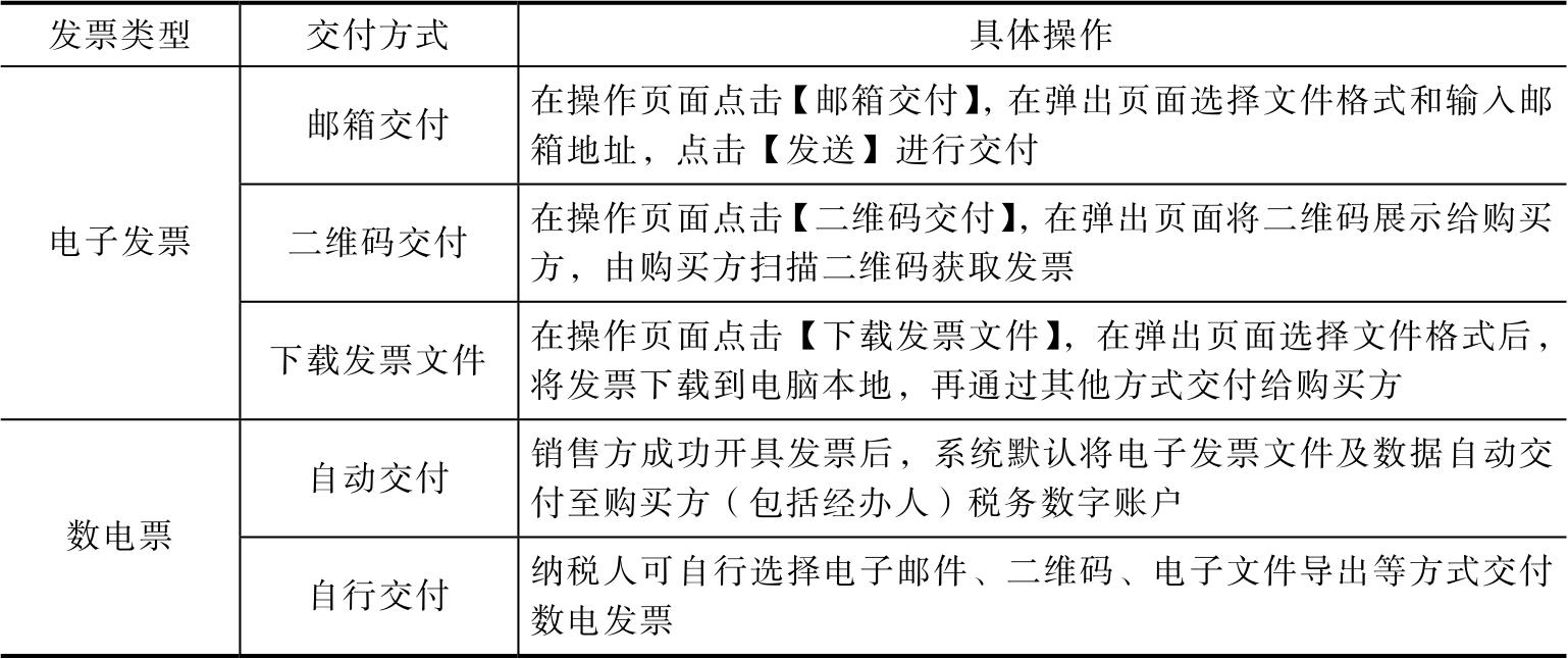 金税四期前的电子发票常用的交付方式是邮箱、二维码、下载发票文件等3种,金税四期试点的数电票优化为自动交付和自行交付2种方式,见表1.1。