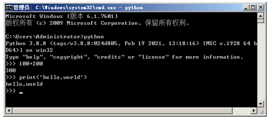 学过Python的人都知道,在交互模式的提示符>>>下直接输入代码,按回车键后,就可以立刻得到代码执行结果。试着输入“100+200”,再打印一下“hello, world”,结果如图2-4所示。