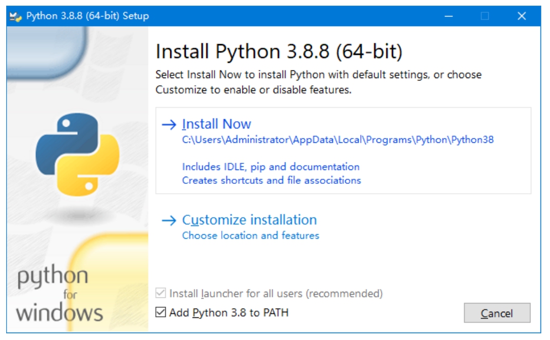 有时候官网打开比较慢,建议直接从本书配套资源中的源码目录下的somesofts文件夹下获取安装文件,文件名是python-3.8.8-amd64.exe,直接双击它就可以开始安装。安装界面如图2-2所示。注意,勾选Add Python 3.8 to PATH复选框,可以把Python安装目录加入PATH环境变量中,再单击Install Now继续安装。