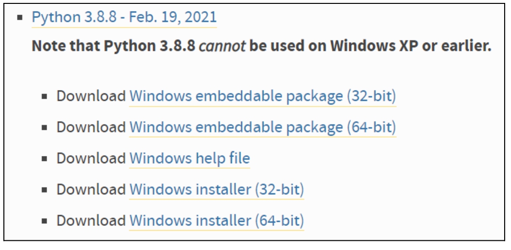 Python 3.8.8版本的安装文件可从官网www.python.org下载,我们可以根据自己操作系统的位数选择下载32位或者64位的安装文件,如图2-1所示。