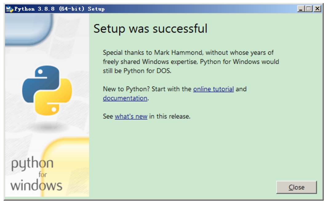 安装成功后,界面如图2-3所示。打开一个命令行窗口,输入“python”,就可以查看到Python版本(3.8.8)的相关信息了。
