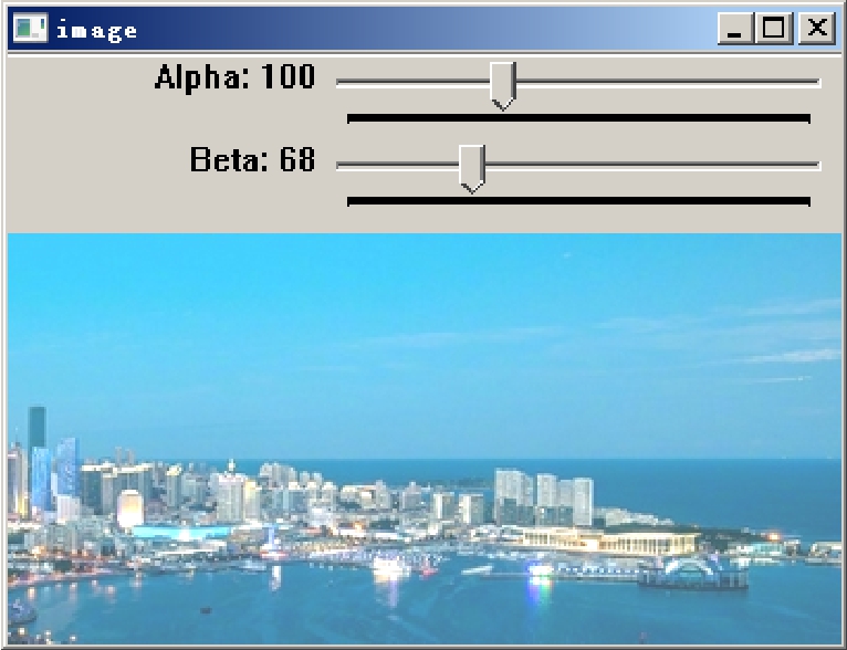 在上述代码中,首先读取test.jpg,然后定义滑动块的两个回调函数updateAlpha和updateBeta,接着利用函数namedWindow创建1个窗口,并利用函数createTrackbar创建2个滑动条,这样窗口上就有2个滑动条。updateAlpha和updateBeta都是滑动条的回调函数,用于响应用户滑动滑块这个事件。最后一个while循环,等待用户按Q键退出。在回调函数中,np.uint8是专门用于存储各种图像的(包括RGB、灰度图像等),范围是0~255。该函数接收的参数是一个数组。需要注意的是,clip函数的返回值是uint8的参数,但是这个函数仅仅是对原数据和0xff相与(和最低2字节数据相与),这就容易导致如果原数据大于255,那么在直接使用np.uint8()后,比第8位大的数据都被截断了。clip函数将数组中的元素限制在a_min与a_max之间,大于a_max的就使得它等于a_max,小于a_min的就使得它等于a_min。它的原型是numpy.clip(a, a_min, a_max, out=None)。其中,a是一个数组,后面两个参数分别表示最小值和最大值。代码中的uint8和clip函数,在后面章节还会详细讲到。在上述代码中,首先读取test.jpg,然后定义滑动块的两个回调函数updateAlpha和updateBeta,接着利用函数namedWindow创建一个窗口,并利用函数createTrackbar创建两个滑动条,这样窗口上就有两个滑动条。updateAlpha和updateBeta都是滑动条的回调函数,用于响应用户滑动滑块这个事件。最后一个while循环,等待用户按Q键退出。