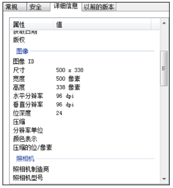 如图1-1所示的图片尺寸可以从其文件属性窗口(见图1-2)中查到,是500×338,即图片是由一个500×338的像素点矩阵构成的,这幅图片的宽度是500像素,高度是338像素,共有169000(500×338)个像素点。