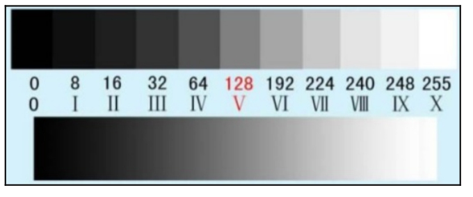灰度级表示灰度图像的亮度层次,比如第1级、第2级……第255级,如图1-3所示。