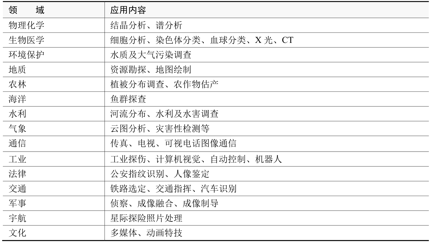图像处理的应用十分广泛,大大促进了现代社会的发展,比如人脸支付、指纹支付就用到图像处理,停车场识别车牌也用到图像处理。下面用表1-1来简要说明图像处理的常见应用。
