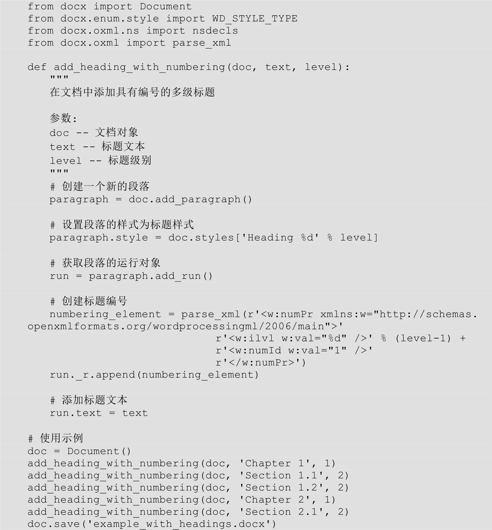 在处理Word文档时,经常需要对文档结构进行调整,其中,多级标题和标题编号是常见的需求。Python-docx库提供了创建多级标题和自动编号的功能,可以方便地生成具有层次结构的标题。