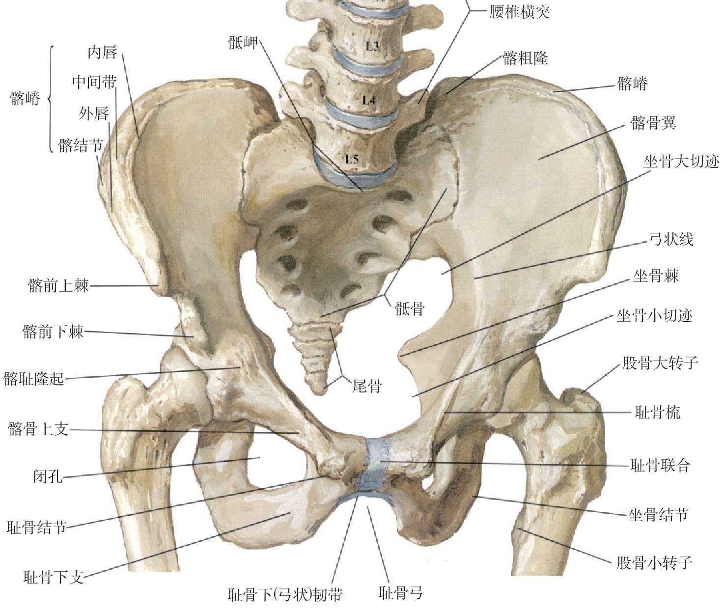 骨盆由左、右髋骨和骶、尾骨以及其间的骨连接构成。界线:由骶岬、弓状线、耻骨梳、耻骨结节、耻骨联合上缘构成的环形线。骨盆由骶骨、尾骨和左右两块髋骨及其韧带连结而成。骨盆被斜行的界线(后方起于骶岬,经髂骨弓状线、髂耻隆起、耻骨梳、耻骨结节、耻骨嵴到耻骨联合上缘连线)分为两部:界线以上叫大骨盆,又称假骨盆,其骨腔是腹腔的髂窝部;大骨盆参与腹腔的组成。界线以下叫小骨盆,又称真骨盆,其内腔即盆腔,前界为耻骨和耻骨联合,后界为骶、尾骨的前面,两侧为髋骨的内面、闭孔膜及韧带,侧壁上有坐骨大、小孔。盆部系指界线以下的小骨盆部分,它包括盆壁、盆膈和盆腔器官等,盆腔上口由界线围成,下口封以盆膈。盆膈以下的软组织称为会阴。小骨盆有上、下两口,上口又称为入口,由界线围线;下口又称为出口,高低不平,呈菱形,其周界由后向前为尾骨尖、骶结节韧带、坐骨结节、坐骨下支、耻骨下支、耻骨联合下缘。两侧耻骨下支在耻骨联合下缘所形成的夹角叫耻骨角,男性约为 70°~75°,女性角度较大,约为 90°~100°。假骨盆与产道、性功能无直接关系。真骨盆容纳子宫、卵巢、输卵管、阴道及邻近的输尿管、膀胱、尿道、直肠等器官。人体直立时,骨盆上口平面向前下倾斜,女性的倾斜度比男性稍大。女性骨盆是胎儿分娩出的产道,所以男女骨盆有着显著的差异(如图 1-8-7、图 1-8-8)。