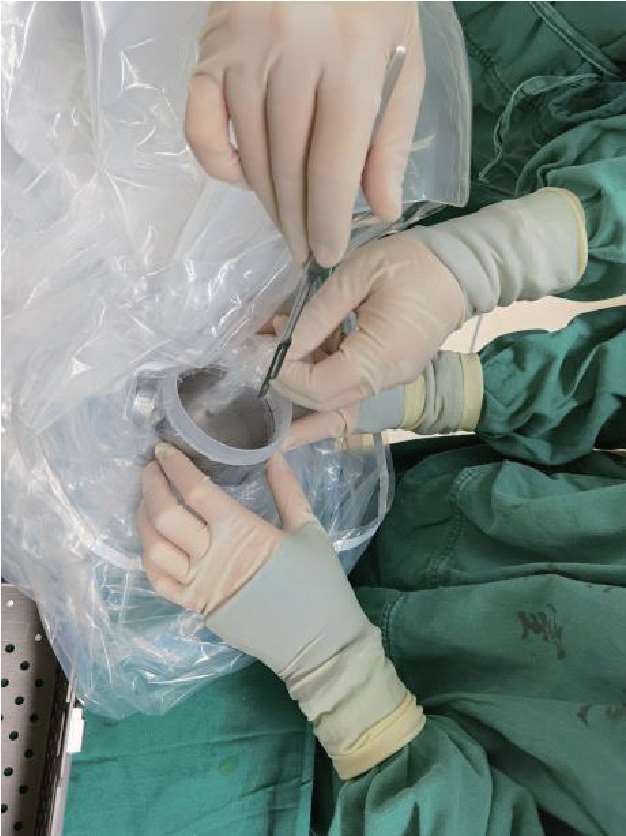 展开无菌套,卡环放进无菌套至底边,齿端向外,将无菌套捋平,将卡环与基座紧密固定,将无菌套外翻,露出卡环,用手术刀将卡环区域封膜行十字切口,洗手护士负责将底座和标尺安装至机械臂末端,巡回护士负责将无菌套包裹机械臂(如图 1-8-5)。