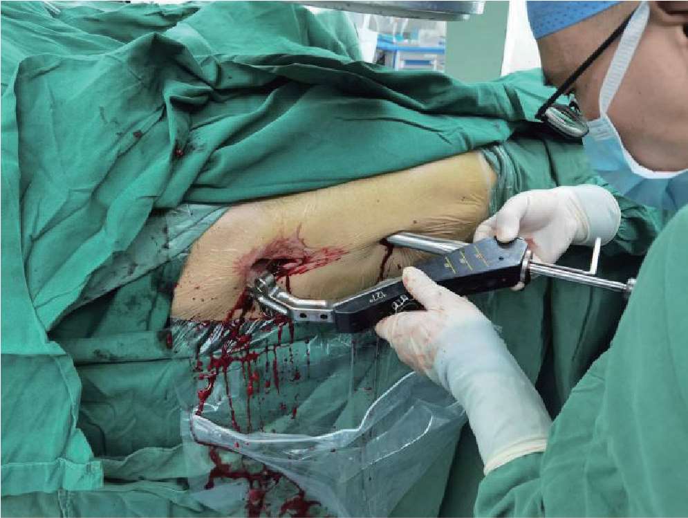 取右股骨近端外侧切口,长约 3 cm,钝性分离外展肌,显露大转子顶点。以大转子顶点处为入口,钻入导针至骨折断端,G型臂透视见导针位置及深度适宜。近端开口,开口软钻及开口管状钻扩髓满意后,置入髓内钉主钉,G型臂透视下调整深度及前倾角合适。将拉力钉套筒穿过拉力钉导向模块并锁扣住,对准相应皮肤位置作一 2 cm小切口,将内套筒穿过并顶住骨皮质。置入拉力钉导针,测深,手动置入拉力钉。移除抗螺旋杆后,拧入加压螺钉直至螺丝刀上的蓝线标记与拉力钉套筒口齐平,最后置入远端交锁钉。G型臂透视确认锁定无误,拆除锁定支架、安装尾帽,G型臂确认尾帽安装无误,骨折解剖复位。清点敷料及器械无误,冲洗,止血,留置负压引流管一根,10×28 角针穿 0 号不可吸收编织线固定(如图 1-9-4)。