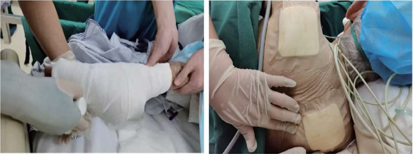 ②防止皮肤受压。膝关节、踝关节及足部用棉垫、水胶体和专用脚套包裹,一般足底部 3 cm厚度,足背部 1 cm厚度,脚趾外露,再予固定。密切观察脚趾的颜色,如足趾颜色发生变化重新打开固定,以防缺血性损伤。会阴支持柱用棉垫包裹后再予安装,男性患者应将外生殖器用纱布包裹后固定于耻骨联合处以避免牵引时压伤。对术前已有会阴红肿青紫的可在会阴支持柱上包裹泡沫敷料,减轻牵拉后对会阴的挤压。患者术前卧床时间较长,臀部贴水胶体和加垫高分子体位垫。保持床单平整是预防臀部压伤的一项基本护理措施,因此,巡回护士在牵拉完毕后一定要伸手将患者身下的床单拉平整,将皮肤拉平,皮肤松弛者尤甚。巡回护士应协助患者非手术部位的活动,观察患者皮肤颜色及温度,注意室温变化,注意患者的保暖,避免因局部过冷而影响血液循环。时间较长的手术,加强观察脚趾的颜色,如颜色变深暗,务必打开重新固定,以防缺血性损伤。