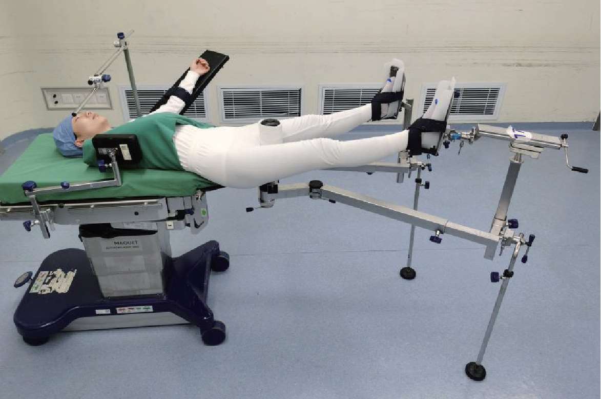 取牵引床位:手术医生站于患者两侧,麻醉医生站于头侧,巡回护士站于尾侧,四人同时轻抬患者移动至床头侧;健侧置于健侧托手板上,患侧手臂置于胸前,会阴柱插入牵引床右侧孔内,双脚放脚蹬内,妥善包扎固定,头架置于托手板一侧,侧挡板阻挡患侧肩处。床单拉至平整,棉被覆盖非消毒区保暖,检查液路和尿管是否通畅。