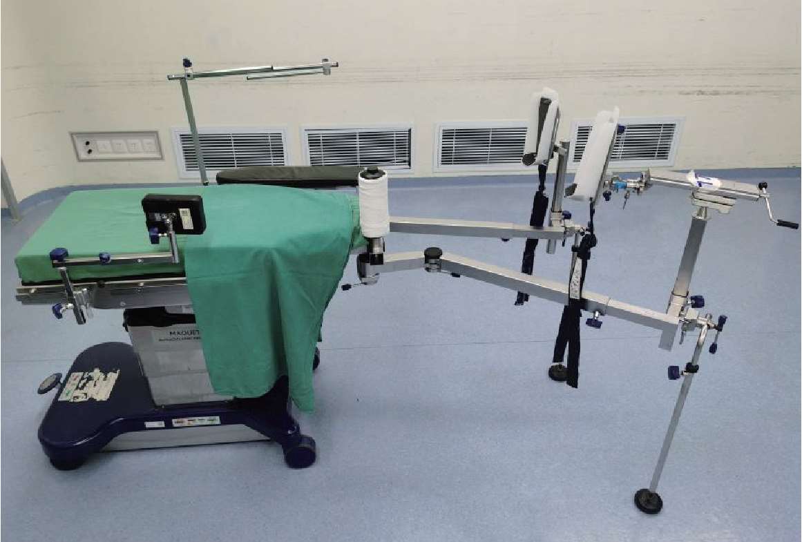 体位垫/设备:根据牵引部位,将适配器及牵引架调试成右侧安置于手术床上,处于备用状态(如图 1-9-1)。