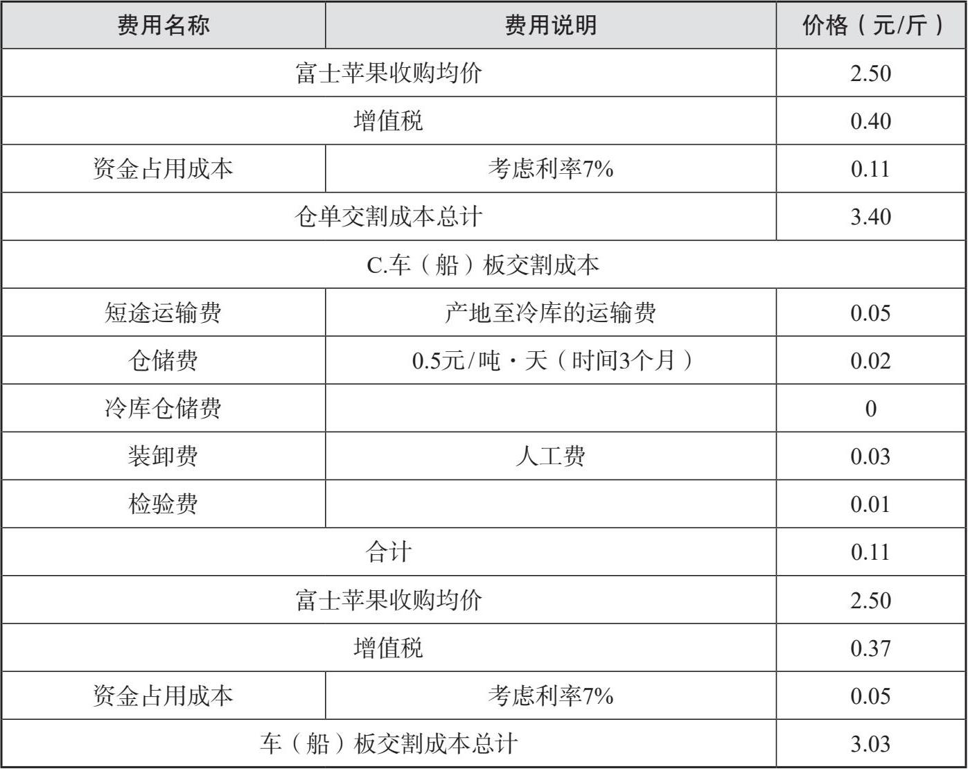 六是仓单成本。苹果做成交割果,中间需要耗费一定的成本,即为仓单成本。苹果现货从原料果制作成一般商品,甚至交割果,是需要一定成本的。以山东烟台某地为例,对苹果制作成一般商品、仓单和车(船)板交割品所花费的相关费用见表2-9。