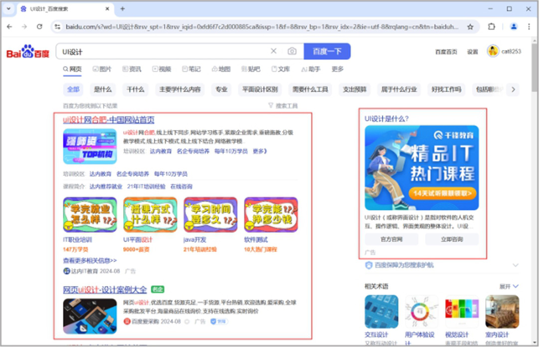 在网站中还有一种文字广告形式,就是在搜索引擎中进行搜索时,在搜索结果页中排在前面的几条搜索结果和页面右侧会出现相应的文字链接广告。这种广告是根据浏览者输入的搜索关键词而变化的,这种广告的好处是可以根据浏览者的喜好提供相应的广告信息,这是其他广告形式难以做到的。图1-54所示为搜索结果页面中的文字广告。